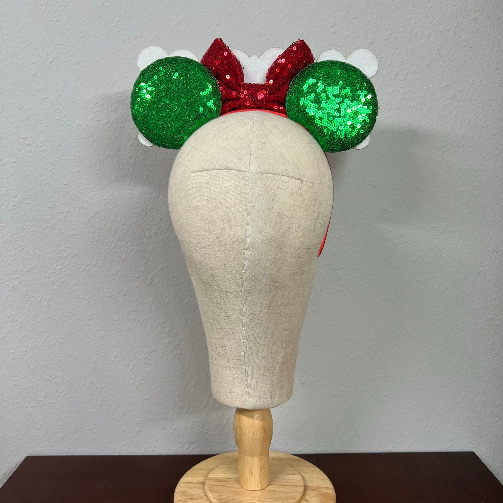 Green sequin ears feature glittery mouse-shaped gingerbread cookies, while a festive red sequin bow is topped with a sparkling gingerbread house. Finished with red, green, and crystal rhinestones, these ears are perfect for Mickey’s Very Merry Christmas Party, Jollywood Nights, or cozy park strolls! ✨