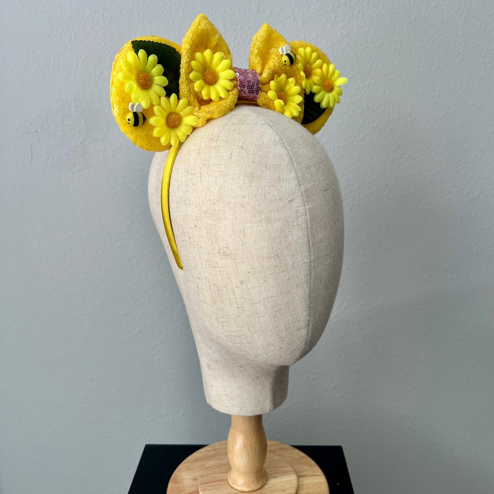 Featuring yellow sequin ears, a yellow sequin bow, and yellow fabric daisy flowers, these mouse ears are designed to be lightweight, comfortable, and eye-catching — perfect for theme park trips, outfit styling, birthdays, photoshoots, and magical vacations.