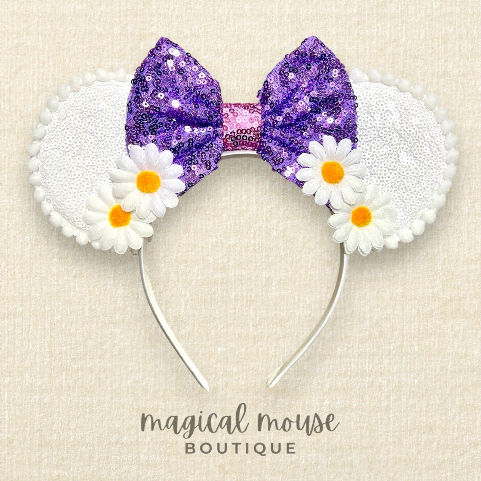 Featuring white sequin ears, a purple sequin bow, fabric daisy flowers, and finished with a white pom-pom trim, these mouse ears are designed to be lightweight, comfortable, and eye-catching — perfect for theme park trips, outfit styling, birthdays, photoshoots, and magical vacations.