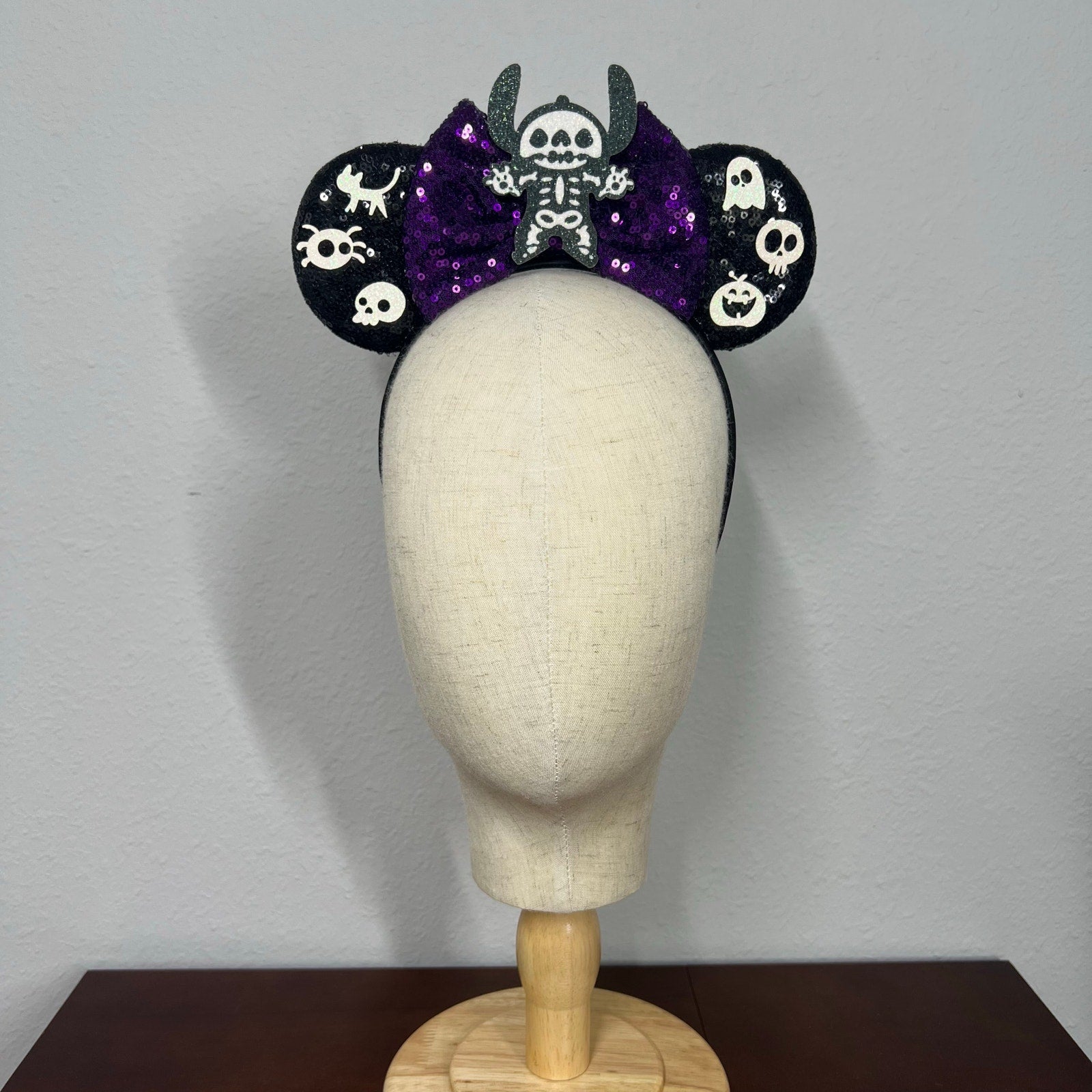 ππ» Boo to you! These Skeleton Party Mouse Ears are a frightfully fun addition to your spooky season lineup. Featuring black sequin ears covered in glittery Halloween icons (cats, ghosts, skulls & more!) and a bold purple sequin bow topped with a glittery skeleton inspired by Disney's Lilo & Stitch, these ears are ready to haunt the parks with you! Perfect for a party at the parks or your next eerie adventure! π·οΈπ